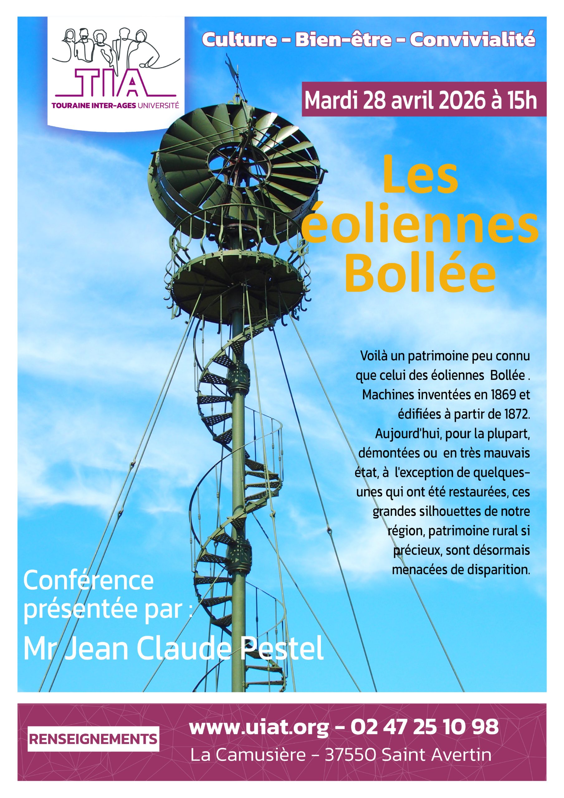 Revenu dans ma Touraine natale, j’ai adhéré à la Société Archéologique de Touraine et me suis impliqué dans la protection du patrimoine en créant une association, C’est a ce titre que j’ai œuvré à la sauvegarde de l’éolienne Bollée d’Esvres sur Indre.